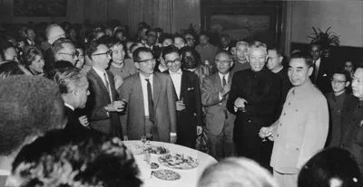 1956年5月26日,周恩来在招待出席全国科学规划会议代表的酒会上,同科学家们亲切交谈。