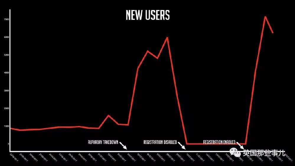 (每天注册的人数,第一个波峰是因为AlphaBay被端掉。 之后10天停止注册,开放注册之后又迎来高峰,最高每天注册超过7000人)