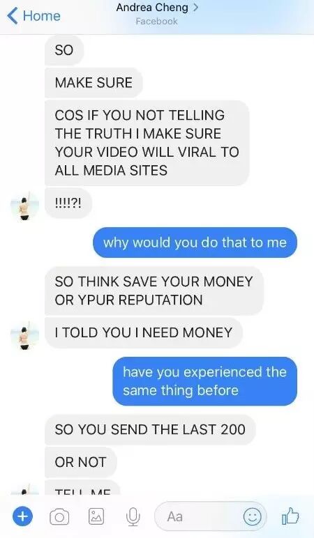 这就是美国俗称“裸聊诈骗”的犯罪形式,先通过fb等各种方式发信息加好友试探,再发信息问候拉近距离,在视频聊天中悄悄录下来,最后以上传视频威胁受害者打钱。