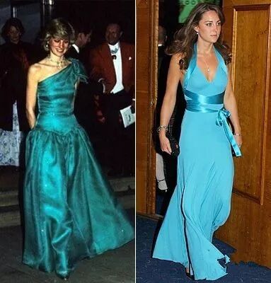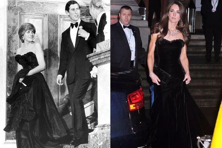左边是黛安娜1996年在美国出席晚宴的造型,右边是2011年凯特去美国时候的样子,