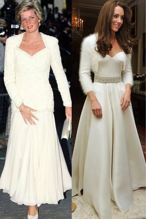 左边是1986年黛安娜出席活动穿的白底金丝礼服,右边是2012年凯特在马来西亚的造型。