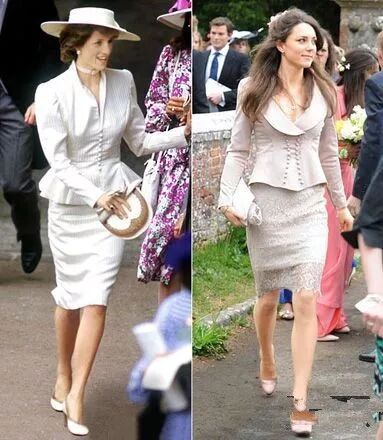 左边是黛安娜1988年穿的白色套装。右边是2011年凯特举行婚礼后离开克拉伦斯宫的造型。