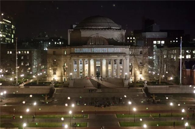 他们主动帮助Emma扛起床垫,并在校内打出抗议标语;还有人用灯光在哥大的主建筑楼上打出“Columbia Protects Rapists” (哥大包庇强奸犯)的字样。