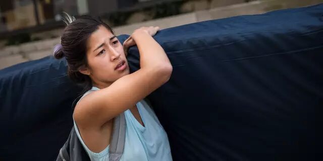 用床垫来象征她要背负着那件事带来的阴影和负担前行。