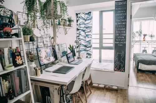 原本放沙发的地方改成了工作区,小梦和建洲可以在这里画画修照片。格铁丝照片夹,四处可见的绿植,都洋溢着浓浓的生活气息啊。