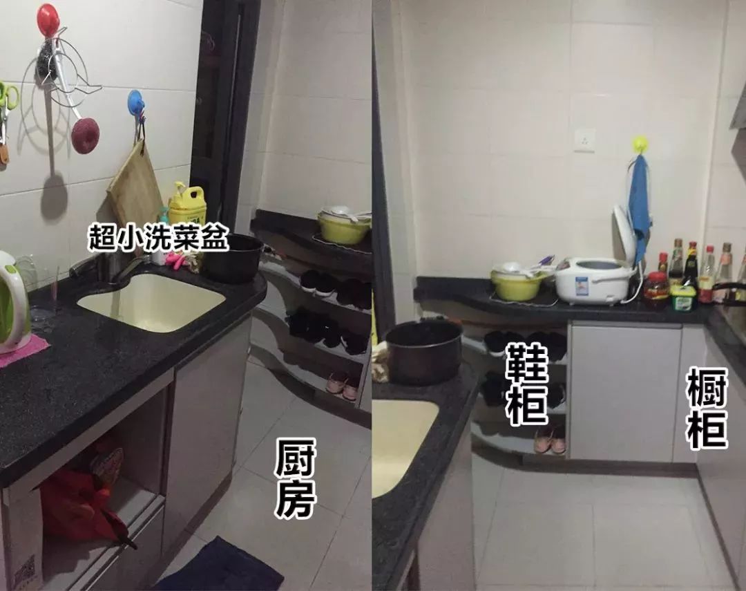 厨房逼仄的空间,一个人站着都有点挤,鞋柜和橱柜竟然还摆在一起......这对爱做饭的小梦来说,简直不能忍!