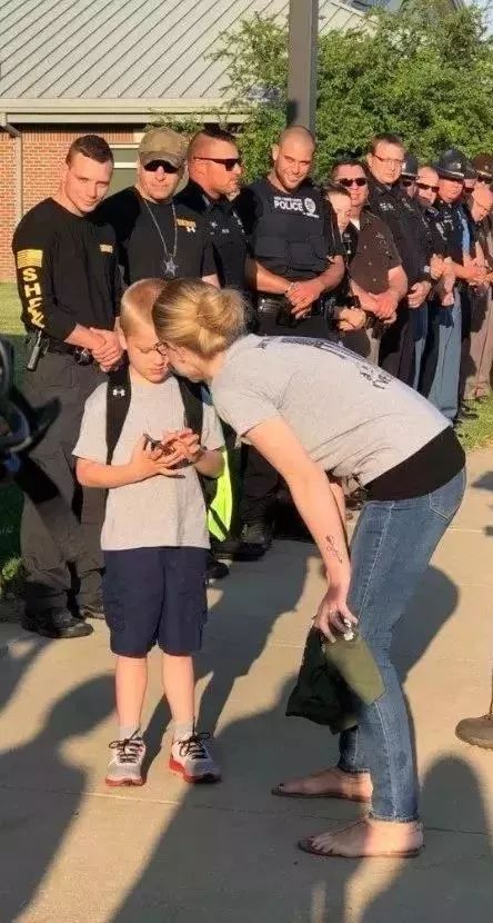 而这些警察,全都是听到小家伙的心愿,自发前来护送、陪伴,他们站在那儿,像一双巨大的翅膀,保护着这个刚失去父亲的孩子。