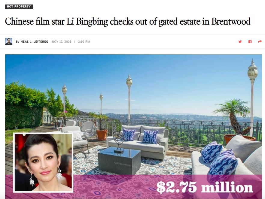 中国女星李冰冰在2016年,就因为卖房上了美国报纸头版。据《洛杉矶时报》报道,李冰冰仅仅用了三周就闪售了其在洛杉矶西端的豪宅。