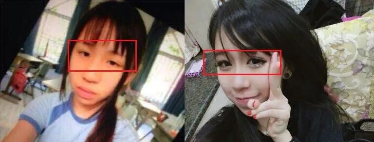 虽然后来都是仿佛粘了胶水的眼妆,但是还是能看出眼型的改变,而且左边那张图的双眼皮就已经是不自然的状态了。