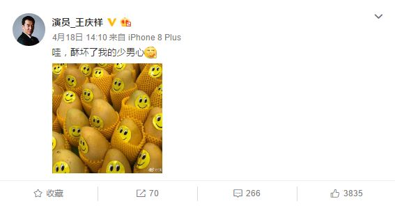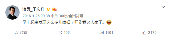 因为在戏中曾经给霍建华、王凯当爹,许多迷妹跑到王庆祥的微博下喊他“公公”。2016年,一条“早上起来发现这么多儿媳妇?”的微博开始,王老爷子的全面放飞自我,老干部形象崩塌,正式变身一名高龄网瘾宝宝。