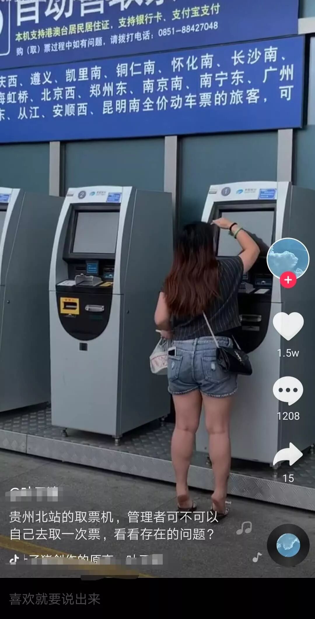 近日,有网友在抖音上发布一条短视频,称贵阳北站有3台售取票机屏幕太反光,机器摆得太高,旅客取票时需要很费劲才能看清屏幕。