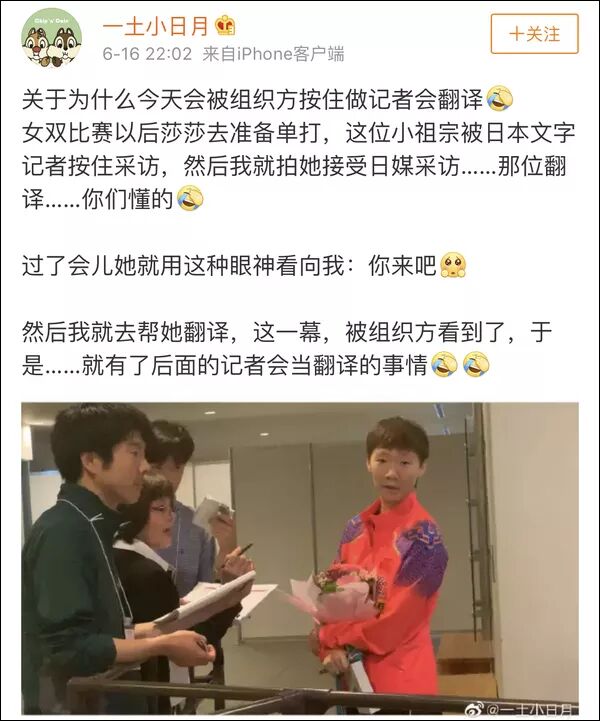 没撑多久,王曼昱发来了求助信号,@一土小日月 便上前帮忙翻译,而这一幕正好被主办方的工作人员看到,这才有了外援翻译的事。