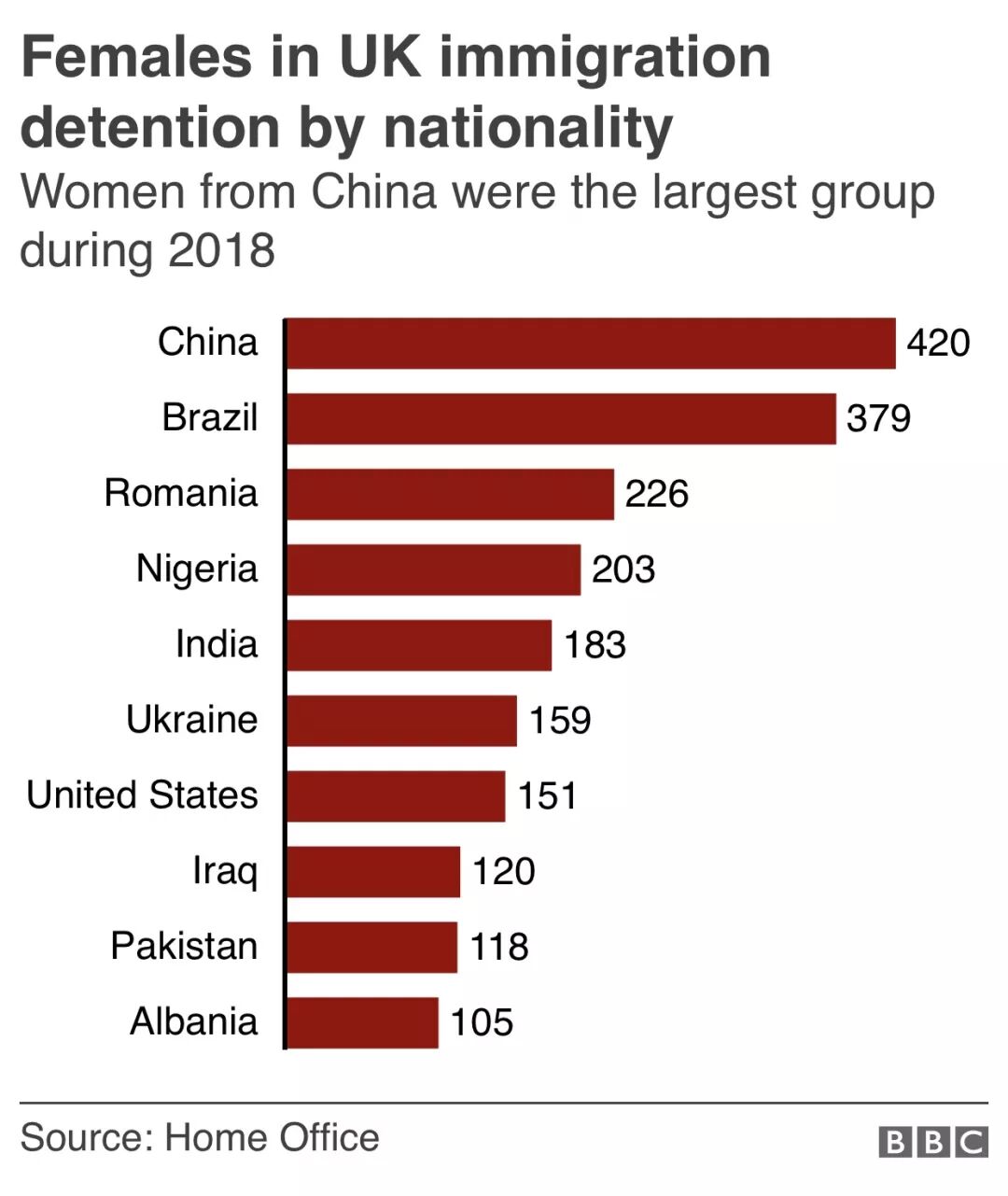 相比巴西,罗马尼亚,尼日利亚等国籍,被拘留的中国女性数量高居榜首。