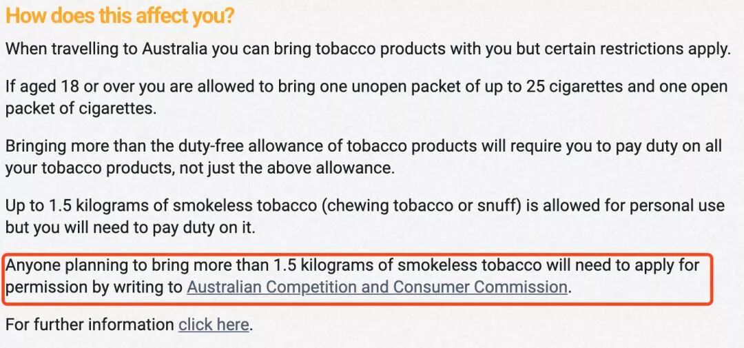 根据澳州政府的最新规定,从2019年7月1日起,要求任何携带超过规定数量烟草的入境人员,