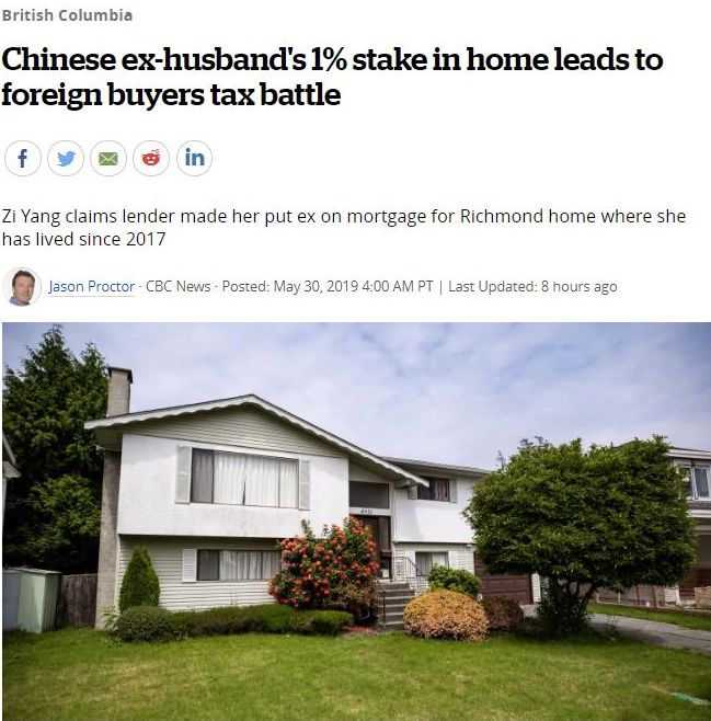 家住列治文的杨女士是永久居民,她的前夫何先生是中国居民,何先生持有她买的房子的1%的占比,而政府竟然要求她支付100%的海外买家税,高达$23.7万加元!