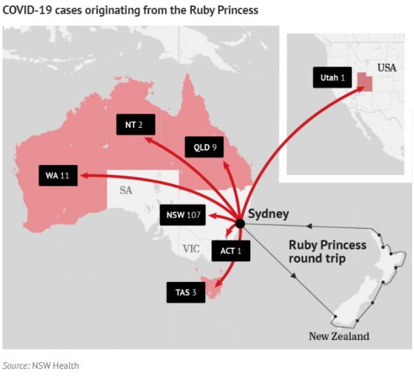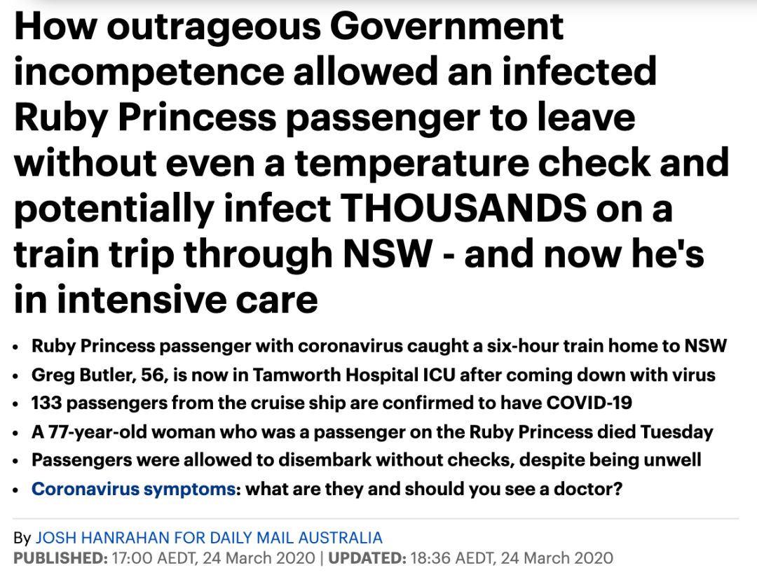 (“一名受感染的Ruby Princess乘客在没有健康检查的情况下就离开,可能在通过新南威尔士州的火车旅行中感染数千人”,每日邮报)