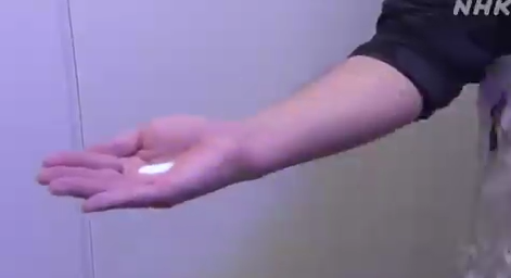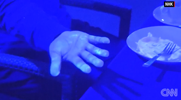 在视频中,一个参加者被假定为新冠病毒患者,手上被抹上了模拟病毒的荧光物质。