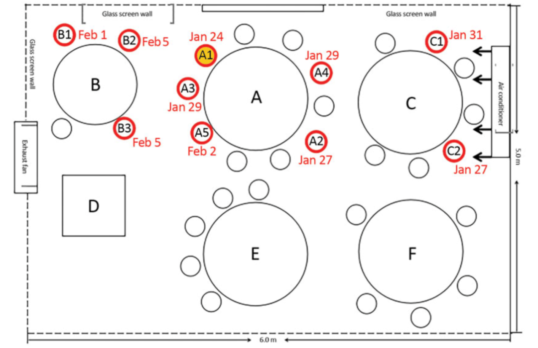 该研究发现,病毒主要是通过飞沫传播,正是3张并排餐桌右边的空调,将带有病毒的微沫吹散,使得空调风所到之处的3桌家庭几乎全部中招。