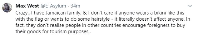 “就离谱……我自己就来自牙买加家庭,我根本就不care是不是有人穿着牙买加比基尼、或者梳着这个头发好吧?这又不影响任何人。这群美国人根本就不懂,其他国家的人其实很鼓励外国人为了旅游目的买他们的文化产物的。”