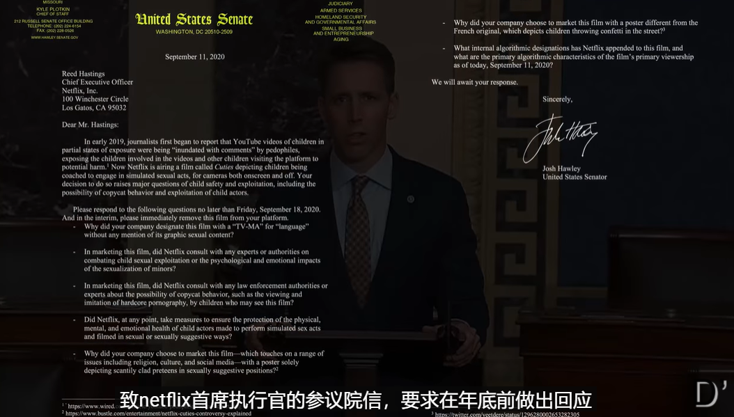 阿肯色州参议院也致信司法部“迅速采取行动”,并且直接说这部电影和网飞就是在犯罪。