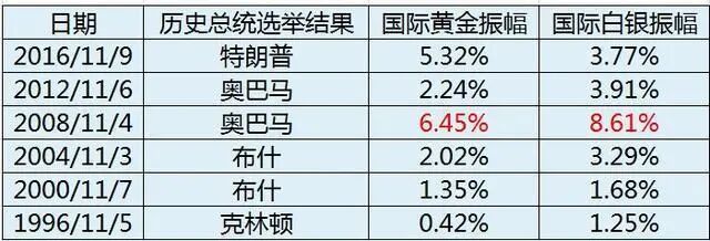 从历年美国大选来看,贵金属当天价格大都会出现剧烈波动。而2008年奥巴马当选美国总统的当天,国际金银波动幅度最大,其中国际黄金振幅超6%,国际白银振幅达8.61%。