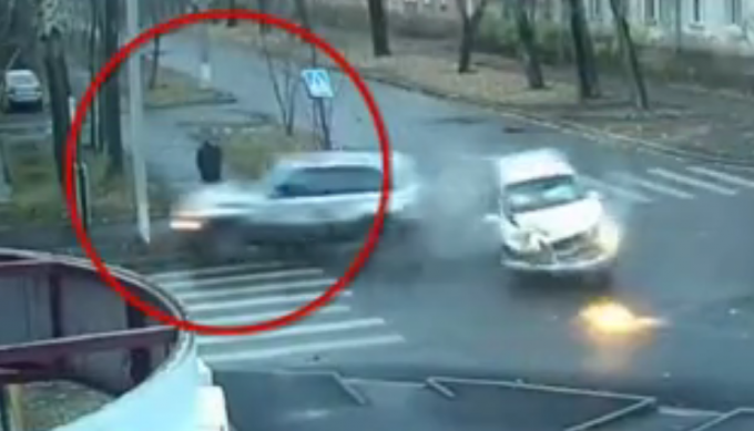 近日,俄罗斯媒体公布了一段视频。画面中一名男子走到一处十字路口附近,此时两辆高速驾驶的车在十字路口发生碰撞。