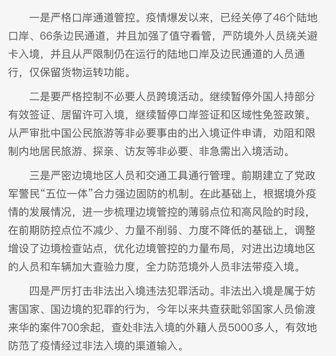 疫情爆发以来,已经关停了46个陆地口岸、66条边民通道,并且加强了值守看管,严防境外人员绕关避卡入境,并且从严限制仍在运行的陆地口岸及边民通道的人员通行,仅保留货物运转功能。