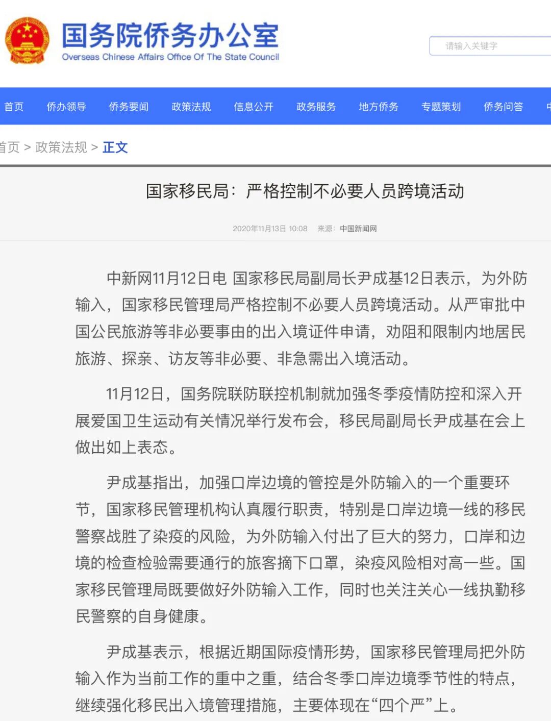 11月13日,国务院侨务办公室转发了中国国家移民局的一份最新声明: