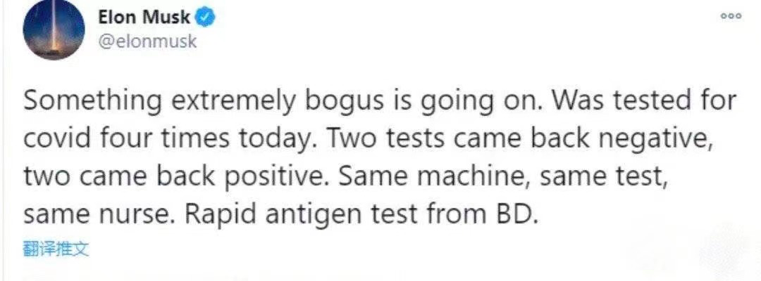 昨日,美国特斯拉公司首席执行官埃隆·马斯克发推称,“一些极其虚假的事情正在发生。今天做了四次新冠检测。两次测试结果呈阴性,两次测试结果呈阳性。同样的机器,同样的检测,同样的护士。来自(美国)BD公司的快速抗原检测。”