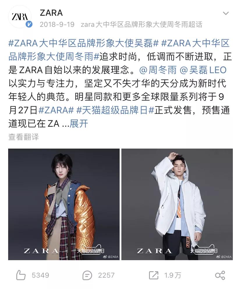 2018年,Zara宣布周冬雨、吴磊为大中华区品牌形象大使。