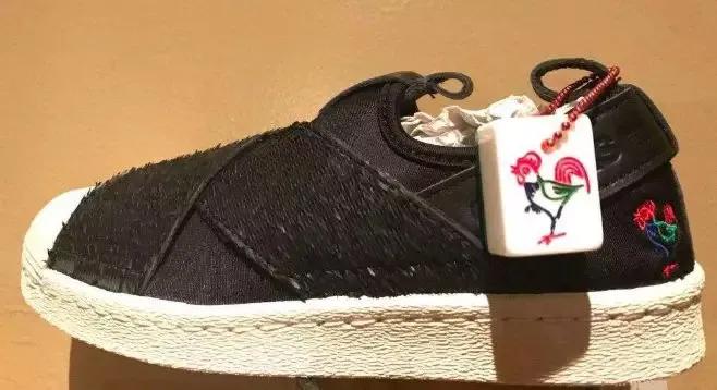 就比如阿迪达斯在鸡年推出过的一款幺鸡麻将鞋,鞋上印着一只鸡,后边挂着一块麻将。