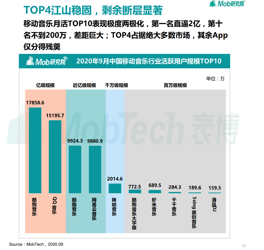 据Mob Tech数据显示,酷狗音乐、QQ音乐、酷我音乐、网易云音乐并列国内四大音乐播放器,其中酷狗音乐用户数量最多,接近1.8亿,网易云音乐用户数量接近1亿。现在音乐播放器头部化愈发严重,多米音乐、虾米音乐等软件已经停止服务,未来用户会进一步聚集在这四大平台。