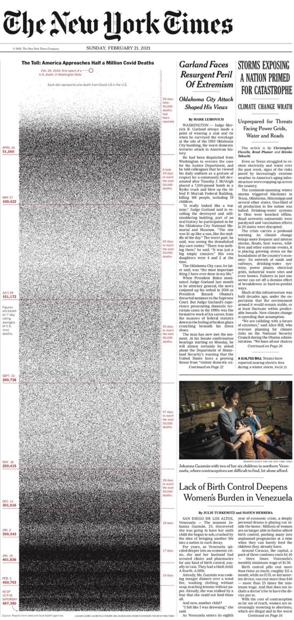 当地时间21日,美国《纽约时报》头版以巨幅点状图揭示了全美新冠疫情灾难:图表时间轴上,一个点代表一个因新冠病毒在美国逝去的生命,从2020年2月29日报告第1个死亡病例迄今,已累计有近50万个死亡病例。