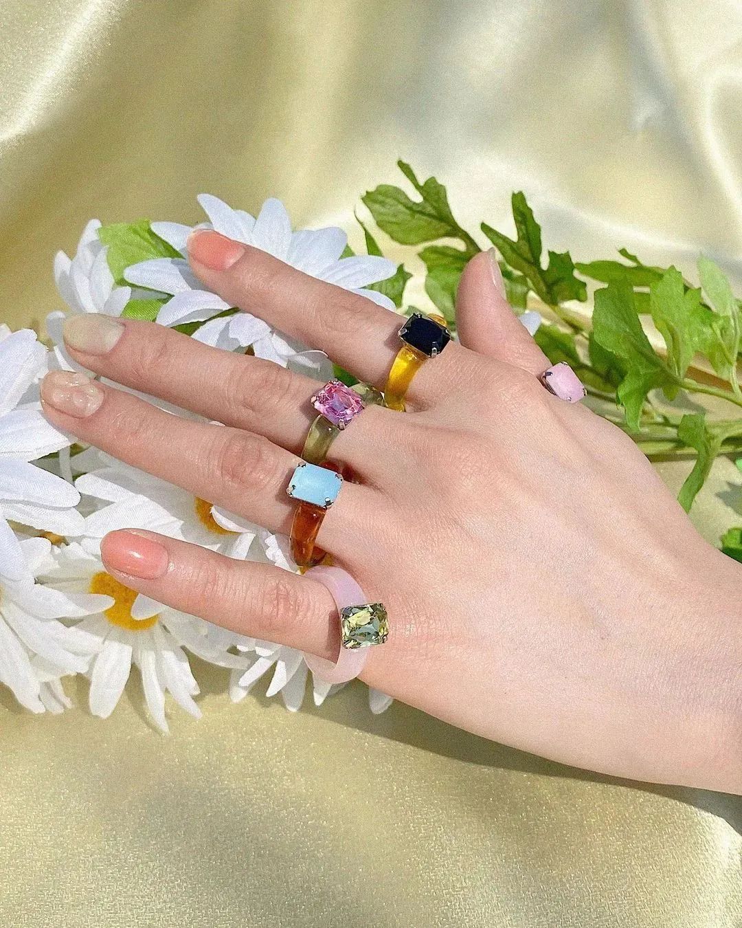 其实这种戒指就是用树脂做成的,看着就不觉得很“贵气”。花花绿绿的颜色像极了糖果,而且越撞色越受欢迎,和你们印象中应该显得“富贵”、“有钱”的配饰完全不同。
