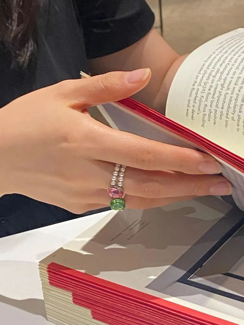 除了这只被Jennie“开了光”的Foi Ring,它们家还有这款以小颗的双层珍珠作为指环的戒指,同样镶嵌了整颗状的彩色方形宝石,粉色、蓝色和绿色都有,非常具有复古韵味。