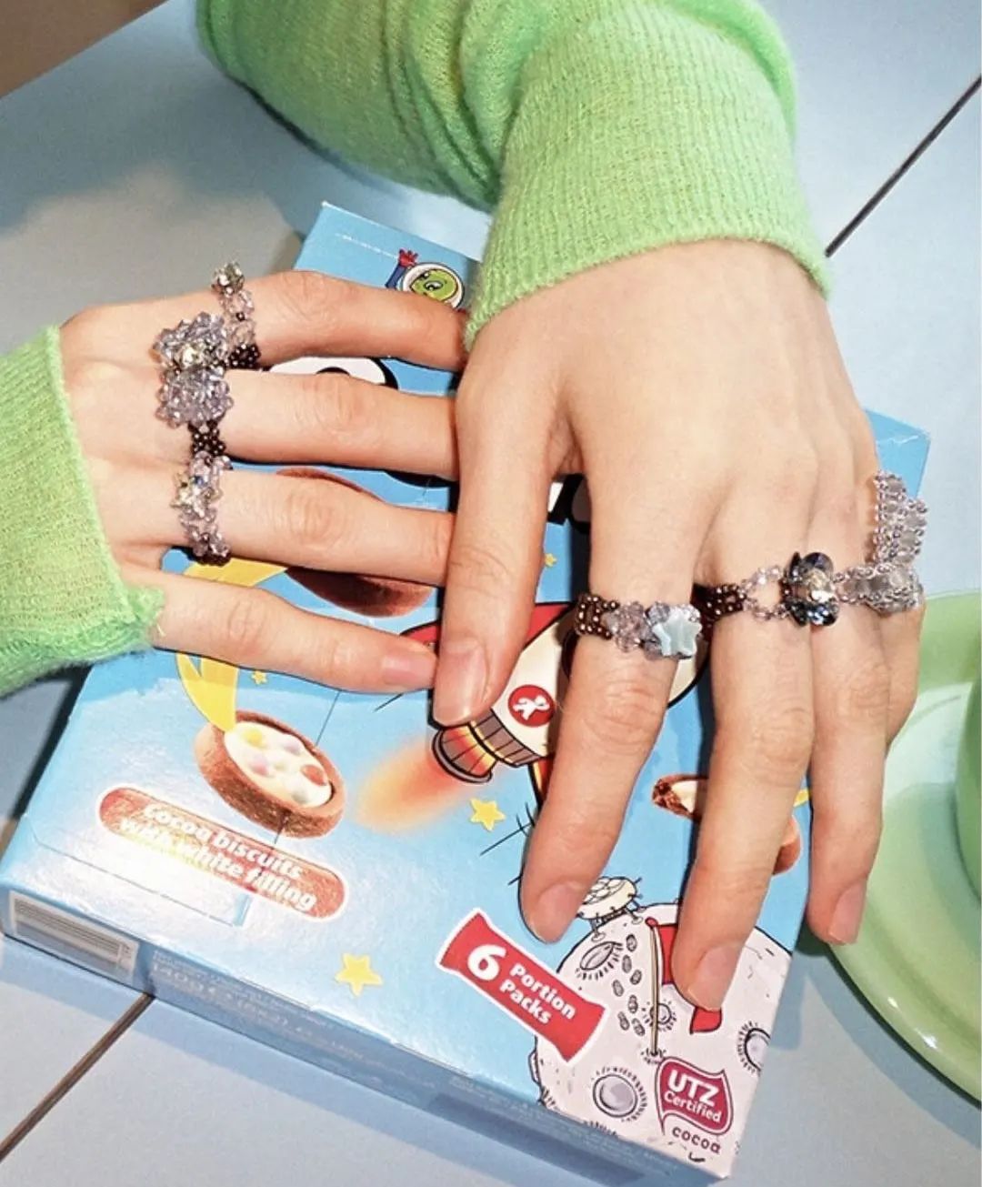 Jennie近期自拍里晒出来的戒指,就是她最爱的品牌,来自韩国的yOungly yOungley,也是目前认知度最广的“塑料珠宝”品牌之一(因为编辑已经在网上发现好多仿款了)。