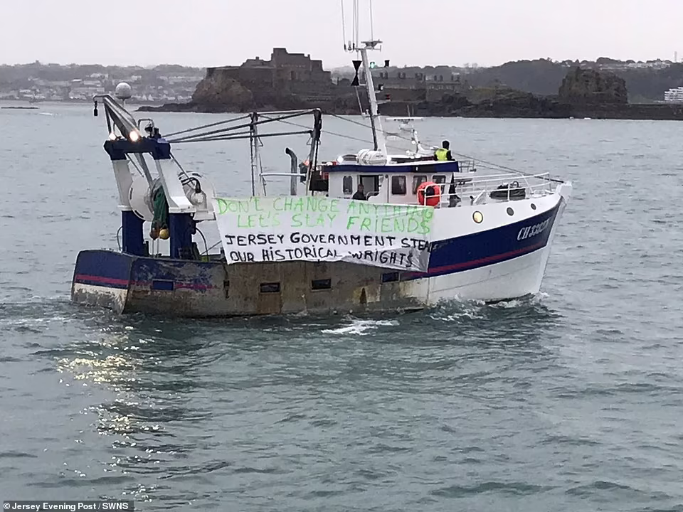 被泽西赶跑的法国渔民越想越生气,于是他们商量好第二天联合起来。凌晨5点开始,大量插着法国国旗,带着标语的船只涌向泽西岛的圣赫利尔港口,围堵在英国海域上,要求泽西政府归还属于他们的捕鱼权。