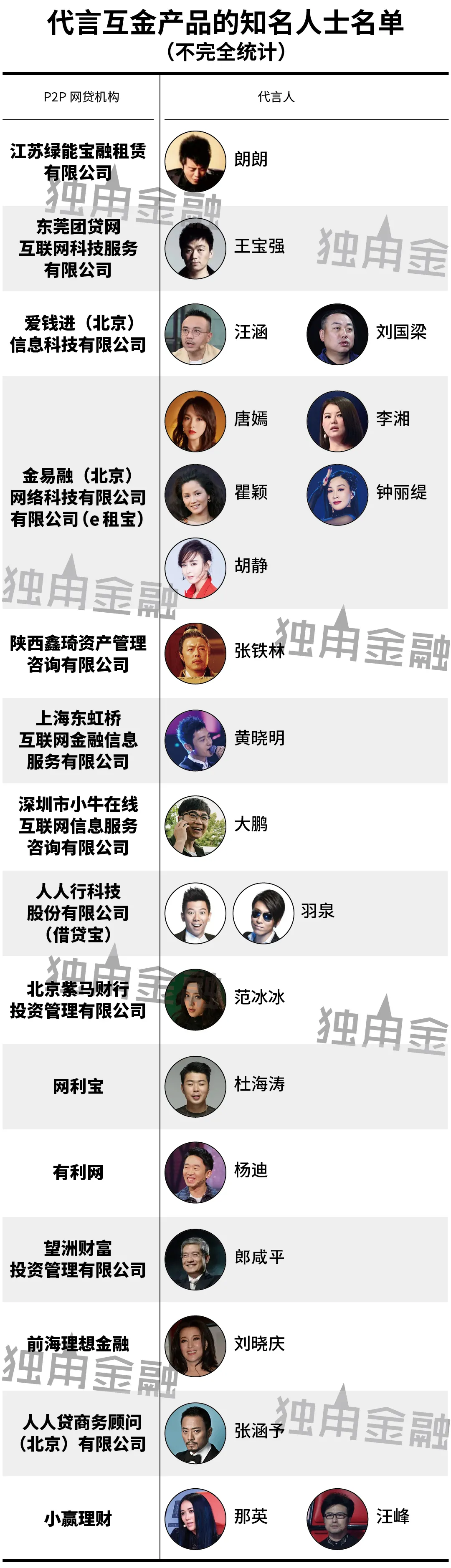 据独角金融不完全统计,艺人张涵予、黄晓明、汪涵、杜海涛、范冰冰、胡歌、王宝强、唐嫣、李湘、瞿颖、钟丽缇、胡静、佟大为、徐璐、张子枫、郎朗、羽泉等都曾代言过此类产品,互金公司们狠下血本,聘请的代言人几乎涵盖了娱乐圈半壁江山。
