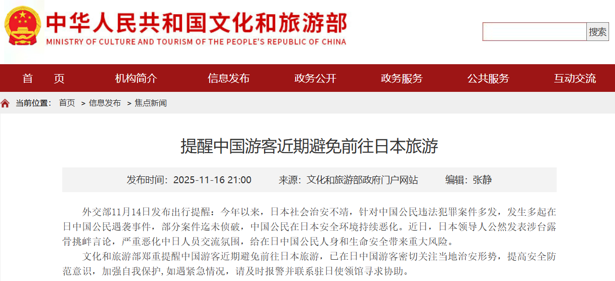 【天维网综合报道】据中国文旅部消息,外交部11月14日发布出行提醒:今年以来,日本社会治安不靖,针对中国公民违法犯罪案件多发,发生多起在日中国公民遇袭事件,部分案件迄未侦破,中国公民在日本安全环境持续恶化。近日,日本领导人公然发表涉台露骨挑衅言论,严重恶化中日人员交流氛围,给在日中国公民人身和生命安全带来重大风险。