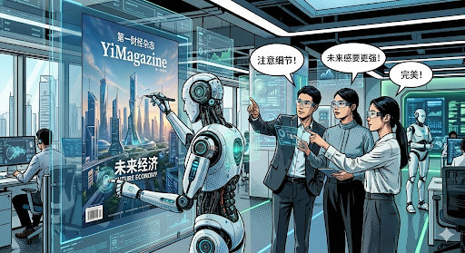 记者第一次是让Nano Banana 的第一代和现在的Pro分别生成一张未来的新闻编辑部的照片,一个未来的AI机器人绘制杂志的封面,旁边几位专业人士在指导绘画细节,强调未来感、高清、细节。