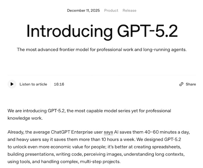 【天维网综合报道】当地时间12月11日,OpenAI正式发布新一代大模型 GPT-5.2,主打通用智能、编码能力和长上下文任务处理,作为近期连续版本更新中的又一项核心升级。