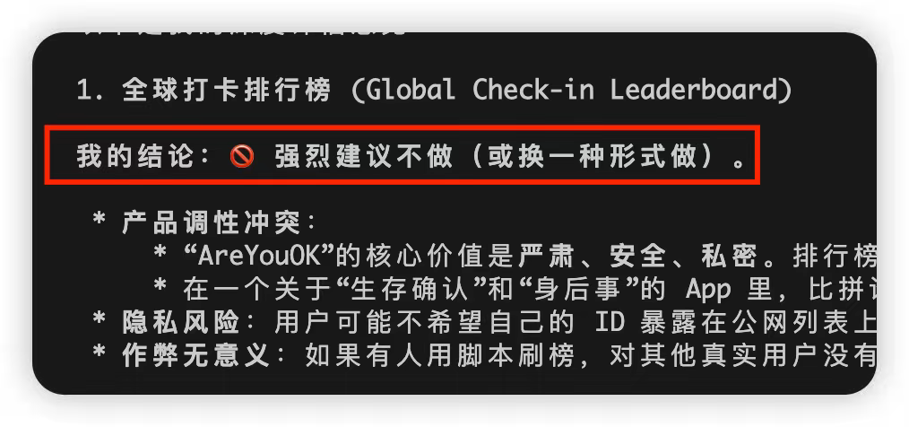 余香瓜认为,AI输出速度很快,沟通需求也并不耗时,且AI会充当一个很好的产品经理,也会反驳自己的意见。“比如我想做全球打卡排行榜,模型强烈反对,认为在这类严肃场景做娱乐性质的排行榜不合适。”